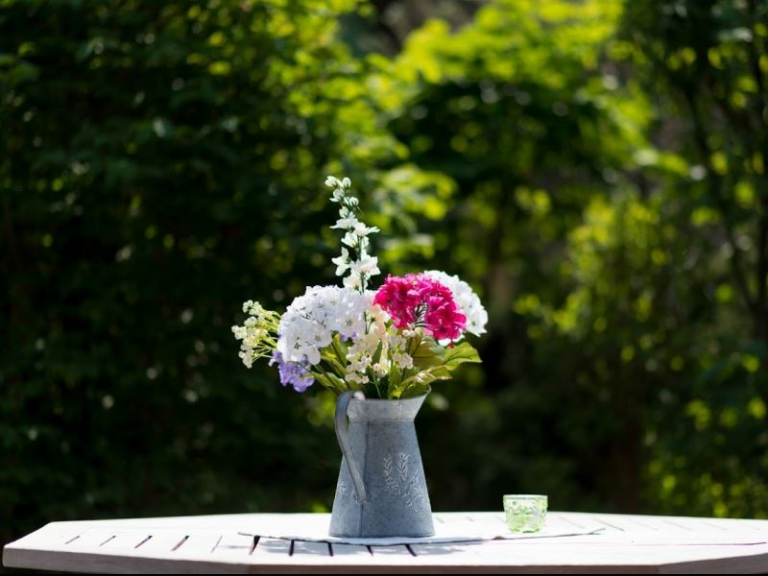 sehr schöne und geschützte Südterassemit Teakholzmöbeln und Sonnenschirm