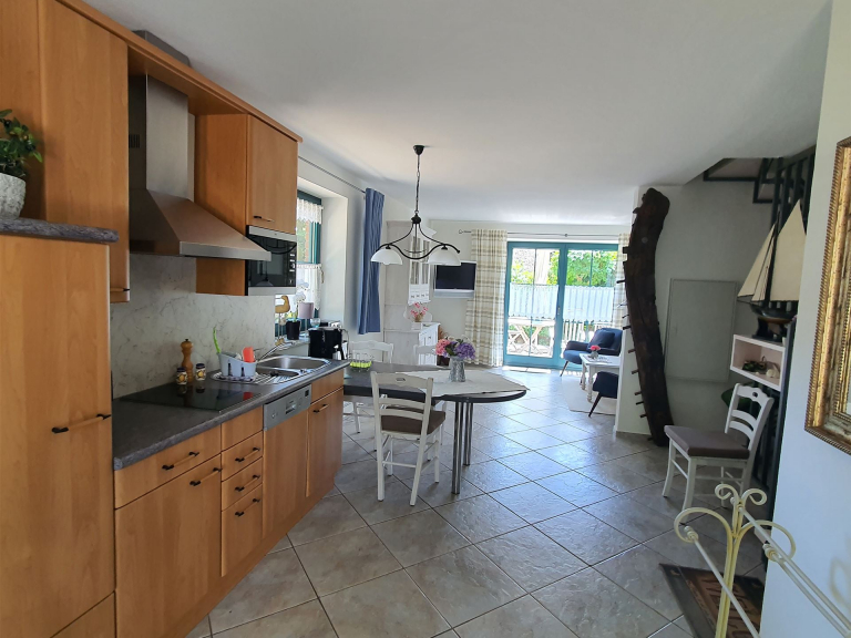 offene komplette Küche mit Ceranherd, Mikrowelle, Geschirrspüler und umfangreichem Zubehör
