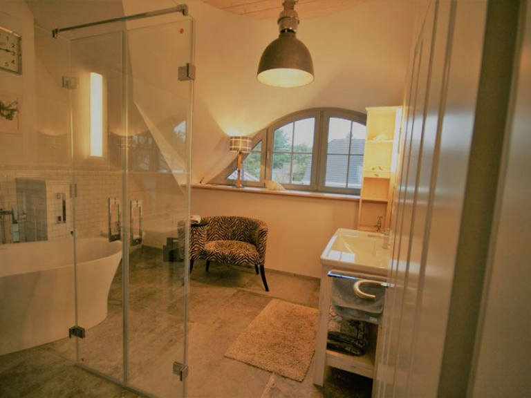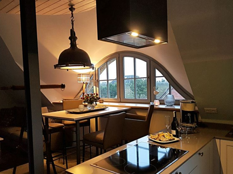 Unser Apartment „Im Kontorhaus“ bietet unter dem Schilfdach eine Wohnung im Dachgeschoss für zwei Personen in einem traumhaften Mix aus Luxus, Lifestyle, Lässigkeit und Komfort. Der lichtdurchflutete große Wohn-Ess-Bereich bietet ein harmonisches Raumgefühl mit ganz eigenem Charakter. In der perfekt durchdachten Küche werden Sie mit Freude zum Chefkoch. Der großzügige Essbereich mit Blick auf den lebendigen Bodden bietet Platz für gesellige Stunden, die gemütliche Sofaecke (mit Flatscreen-TV) lässt Sie kuschelige Momente erleben und wenn Ihnen nach romantischer Gemütlichkeit ist, erzeugt der Kamin (einsehbar auf 270°) echte Darßer Wohlfühlstimmung. Das schmucke Designerbad beherbergt eine Dusche, eine freistehende Badewanne und ist gemütlich möbliert.