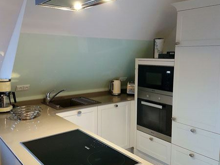 Kreative Tischlereieinbauten werden Sie im Schlafzimmer ebenso begeistern wie der Blick von dort aus auf den Kamin. Entspannen können Sie auch auf der Dachterrasse (in Südwest-Ausrichtung) und in komfortablen Gartenmöbeln haben Sie die Möglichkeit romantische Sonnenuntergänge zu erleben. Ein PKW-Stellplatz befindet sich direkt am Haus.