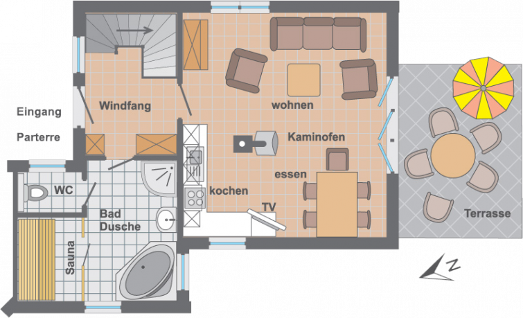 sehr schöne und geschützte Südterassemit Teakholzmöbeln und Sonnenschirm