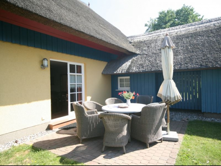 sehr schöne und geschützte Südwestterrasse mit Taekholzmöbeln und Sonnenschirm
