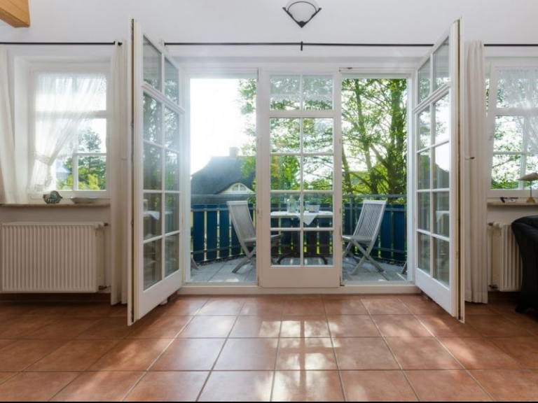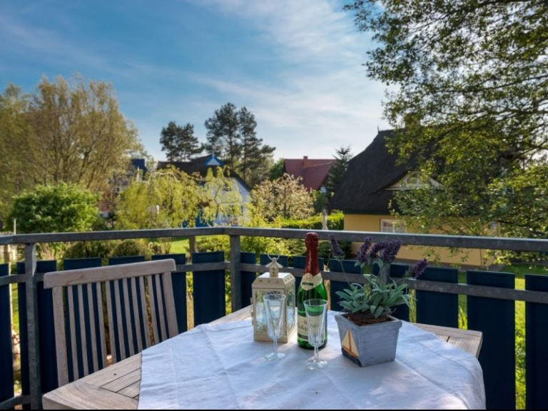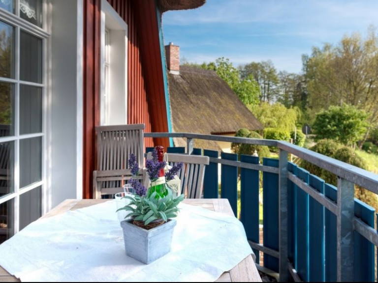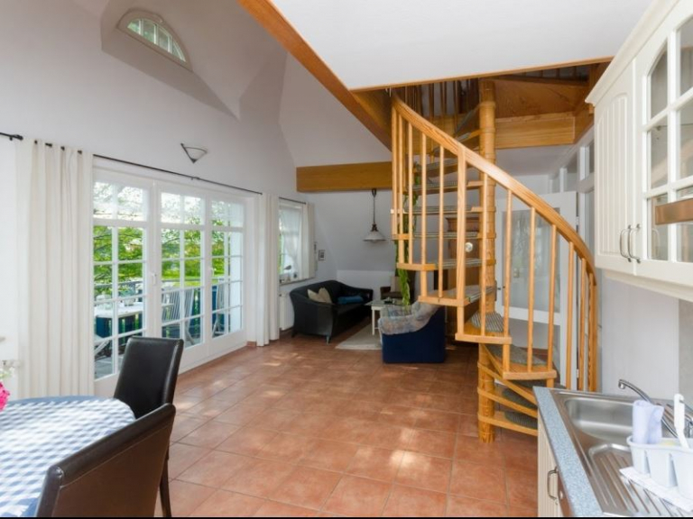 Wie früher: Die Bootsmannskammer über der Kombüse … Die Ferienwohnung mit hellem Wohn- und Essbereich und einem Südwest-Balkon mit Blick auf das kleine Flüsschen Bäk ist ideal für den Urlaub von Pärchen oder kleinen Familien. Das Schlafzimmer ist unter dem Dach in einer gemütlichen Schlafgalerie untergebracht, sie erreichen es über eine Wendeltreppe aus dem Wohnraum.