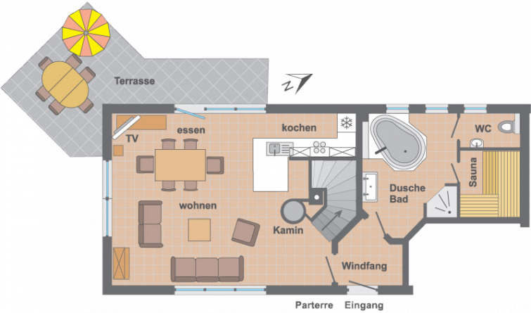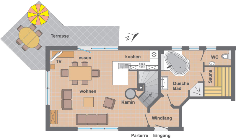 zwei Bäder (im Erdgeschoss mit Dusche, separater Toilette, Whirlwanne und Sauna, im Obergeschoss Dusche, Toilette, Waschmaschine