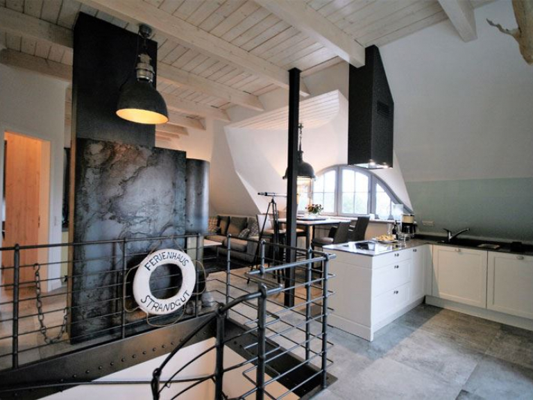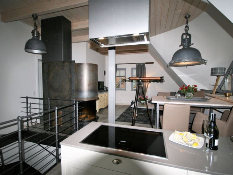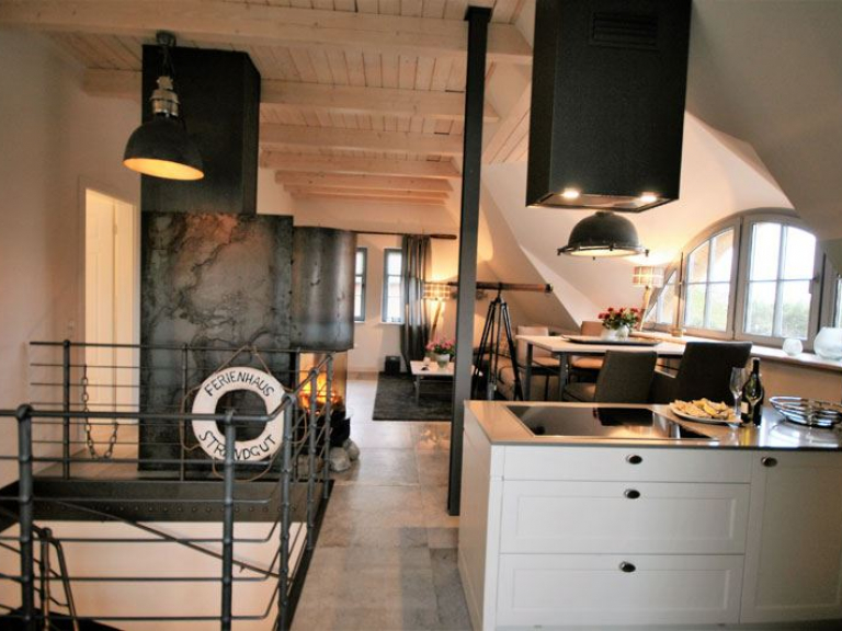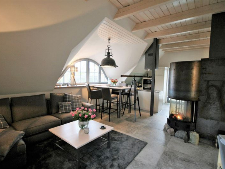 Unser Apartment „Im Kontorhaus“ bietet unter dem Schilfdach eine Wohnung im Dachgeschoss für zwei Personen in einem traumhaften Mix aus Luxus, Lifestyle, Lässigkeit und Komfort. Der lichtdurchflutete große Wohn-Ess-Bereich bietet ein harmonisches Raumgefühl mit ganz eigenem Charakter. In der perfekt durchdachten Küche werden Sie mit Freude zum Chefkoch. Der großzügige Essbereich mit Blick auf den lebendigen Bodden bietet Platz für gesellige Stunden, die gemütliche Sofaecke (mit Flatscreen-TV) lässt Sie kuschelige Momente erleben und wenn Ihnen nach romantischer Gemütlichkeit ist, erzeugt der Kamin (einsehbar auf 270°) echte Darßer Wohlfühlstimmung. Das schmucke Designerbad beherbergt eine Dusche, eine freistehende Badewanne und ist gemütlich möbliert.