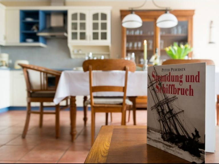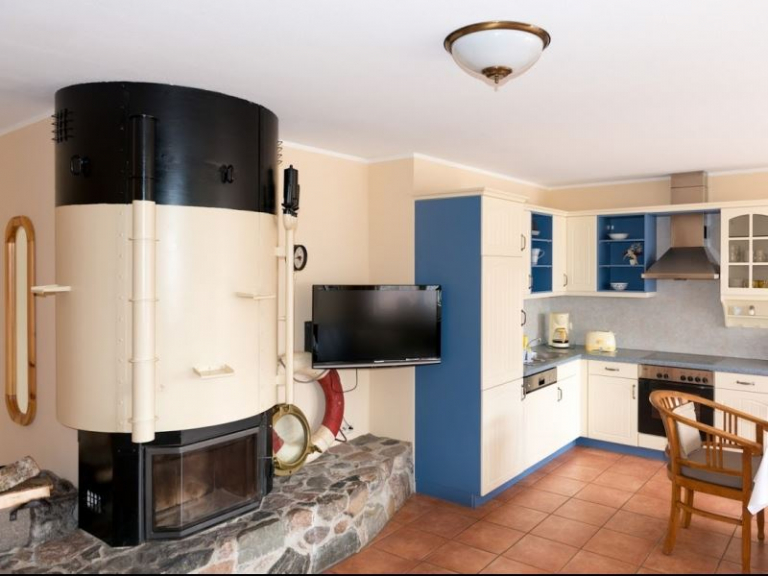 Die Kombüse, der zentrale Ort für alle Seebären. Hier spielt die Musik, hier pulsiert das Leben. Der große Wohn- und Essensraum mit Kamin ist ideal für große Familien oder kleine Gruppen. Die 105 qm große Ferienwohnung ist ebenerdig, mit 3 Schlafzimmern für bis zu 6 Personen, Sauna und Whirlwanne sowie einer sonnigen Südwestterrasse direkt am kleinen Flüsschen Bäk.