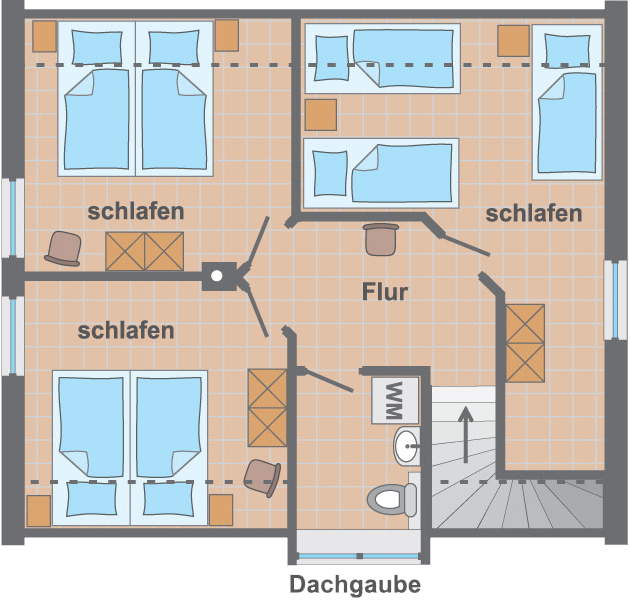 (2 Doppelzimmer, 1 Kinderzimmer mit 3 Betten)Bad mit Dusche und Whirlwanne, Sauna und separater Toilette im Erdgeschoss